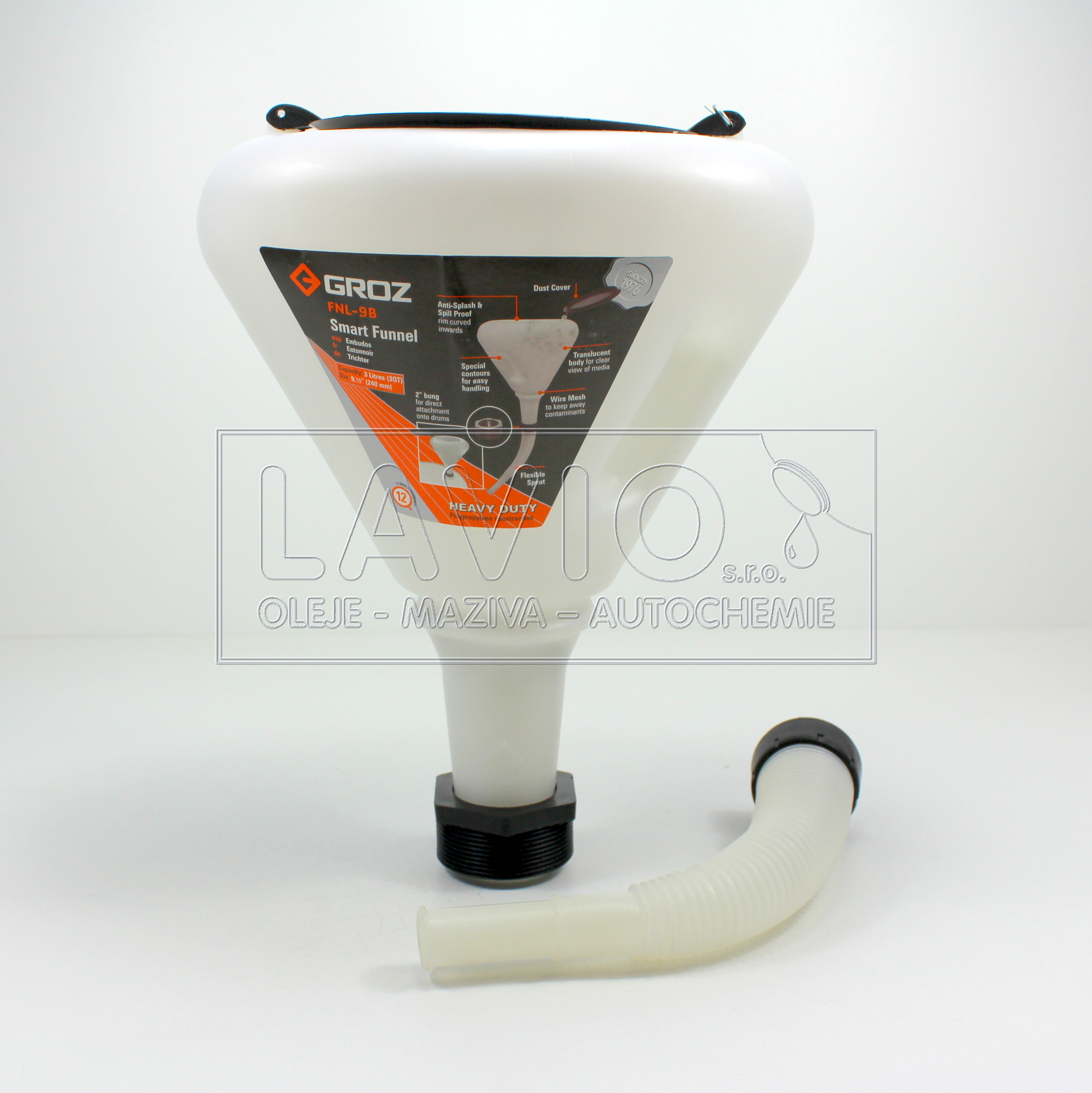 Pevná propylenová konstrukce a tvar nálevky usnadňuje manipulaci – pevné našroubování do sudu nebo volné použití s flexi hadicí. Zakřivenost horní hrany zabraňuje polití tekutinou.